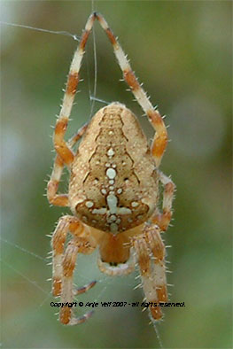 The Orb Web Spider Araneus Diadematus is a common garden spider, which spins a large web in relation to its own size; normal size range 8mm to 20mm. The males are significantly smaller than the females and male fatalities can occur during courtship. Eggs are laid in the autumn and the female will guard her eggs; refusing to leave them to hunt, until she dies. In the following May, newly hatched spiders are coloured yellow with a dark patch on the abdomen. |